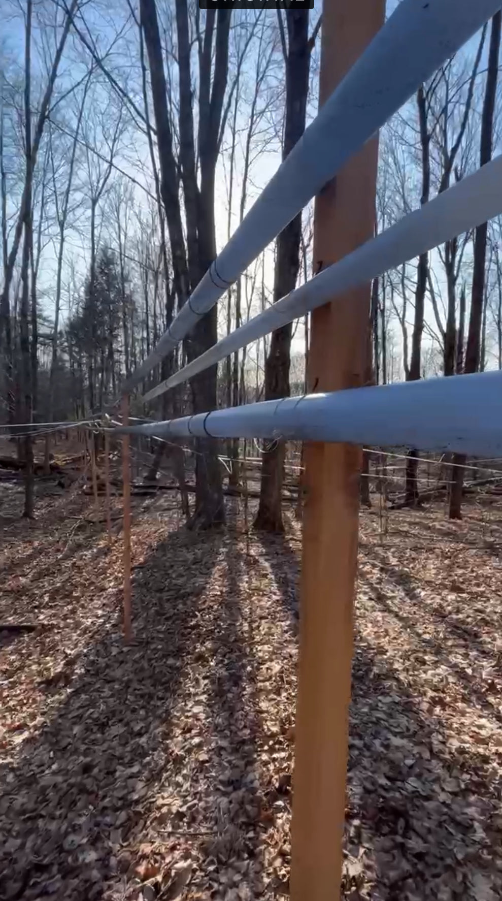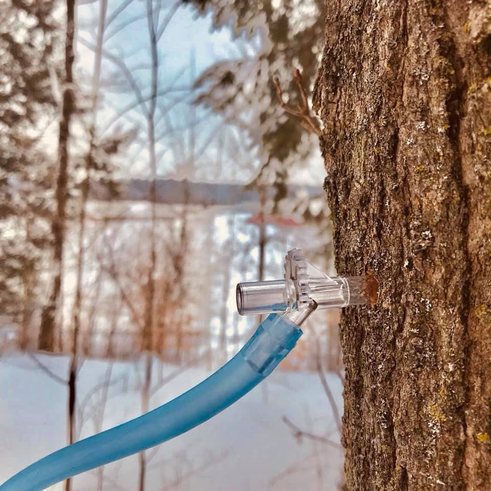 We use a plastic spout that gets drilled into the tree, which our pipeline tubing gets hooked to. This allows the sap to flow directly to the sugar house or one of our pump houses, where we can transport it for processing.